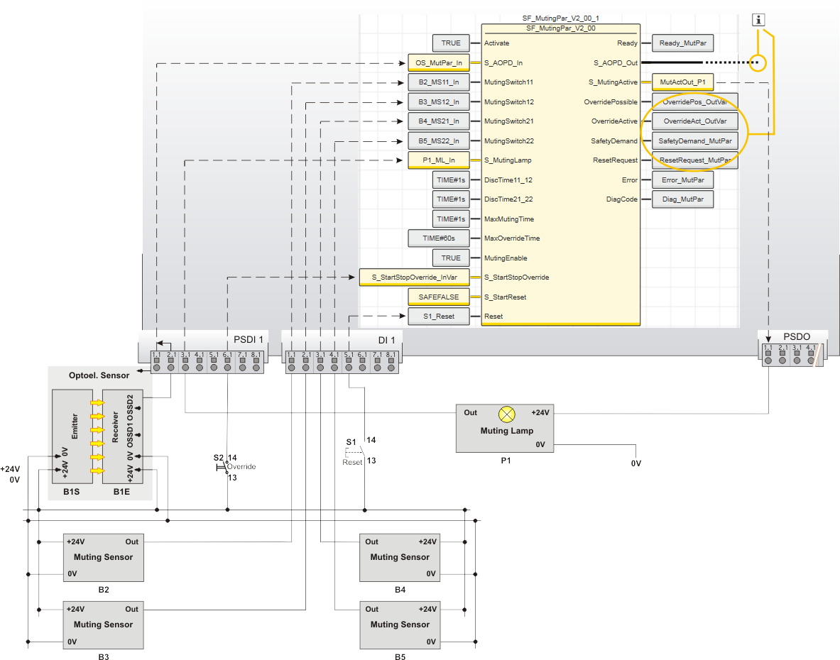 Der Freigabeausgang S_AOPD_Out des sicherheitsbezogenen Funktionsbausteins SF_MutingPar ist über eine globale I/O-Variable oder über weitere sicherheitsbezogene Funktionen/Funktionsbausteine mit einer Ausgangsklemme der Applikation verschaltet.