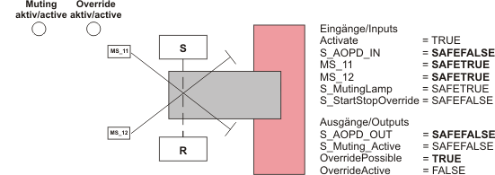 - S/R: safety-related equipment (e.g., light grid), consisting of a transmitter (S) and a receiver (R), connected to function block input S_AOPD_In. The function of this safety-related equipment is deactivated/activated by means of the muting operation.