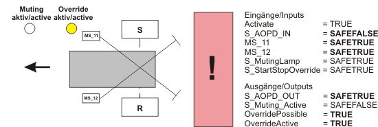 If the muting is interrupted by an error (e.g., the maximum muting time MaxMutingTime has elapsed because of an impermissible object), the safety-related equipment gets activated. This can be temporarily deactivated by the override function, e.g., to clear the zone of operation from the impermissible object.