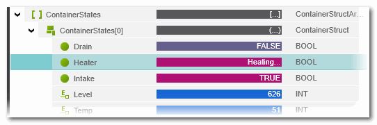 Das Pragma beeinflusst die Online-Anzeige der Variablen zur Laufzeit: Wenn Heater = TRUE, wird der Online-Wert "Heating..." anstelle von TRUE angezeigt. Das folgende Beispiel zeigt das WATCH-Fenster während die Variable TRUE ist und 'Anzeigen > Bezeichner' als Anzeigemodus eingestellt ist ‣ WATCH-Fenster: Applikation überwachen/debuggen