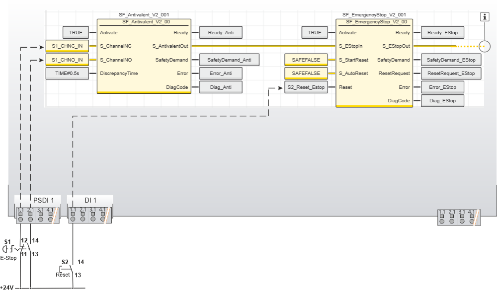 The emergency-stop control device is connected to the inputs 1.1 and 2.1 of the safety-related input device PSDI with an ID of 1. The N/C and N/O contacts of the emergency-stop control device are connected to the safety-related SF_Antivalent function block for evaluation purposes. The S_AntivalentOut enable signal of the safety-related SF_Antivalent function block resulting from this is connected to the safety-related SF_EmergencyStop function block for further evaluation. The S_AntivalentOut output of the safety-related SF_Antivalent function block becomes SAFETRUE when the S_ChannelNC and S_ChannelNO inputs switch as follows within the time set at DiscrepancyTime: