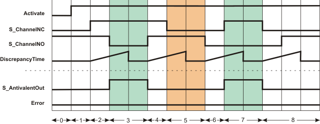 | 8 | S_AntivalentOut switches to SAFEFALSE, as the antivalence comes to an end (S_ChannelNC becomes SAFEFALSE). The discrepancy time measurement starts when the state at S_ChannelNC modifies. S_AntivalentOut and Error remain FALSE, as the second input also changes its state during the discrepancy time (S_ChannelNO becomes SAFETRUE). |