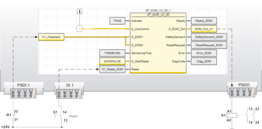 In diesem Beispiel überwacht der sicherheitsbezogene Funktionsbaustein SF_EDM das Schaltverhalten eines an Ausgangsklemme 1.1 des sicherheitsbezogenen Ausgangsgeräts PSDO angeschlossenen Schützes K1. Vom Schütz erfolgt durch einen Öffnerkontakt eine einkanalige Rückmeldung über Eingangsklemme 1.1 des sicherheitsbezogenen Eingangsgeräts PSDI 1 an die Eingänge S_EDM1 und S_EDM2 (einkanalige Anwendung bis Kat. 2). Das resultierende Signal der Eingangsklemme ist mit der globalen I/O-Variablen K1_Feedback verknüpft. Der Reset-Taster S1 ist an Eingangsklemme 1.1 des Standard-Eingangsgeräts DI 1 angeschlossen. Das mit der globalen I/O-Variablen S1_Reset_EDM verknüpfte Signal an Eingangsklemme 1.1 dient zur Aufhebung der Anlaufsperre und zum Rücksetzen von Fehlerzuständen nach Behebung der Fehlerursache.
