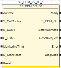 | Kurzbeschreibung | Der sicherheitsbezogene Funktionsbaustein SF_EDM (Externe Schützüberwachung) überwacht den definierten Grundzustand und das Schaltverhalten von Schützen, die an der Sicherheitssteuerung angeschlossen sind.Mit Hilfe von S_StartReset kann eine Anlaufsperre vorgegeben werden.