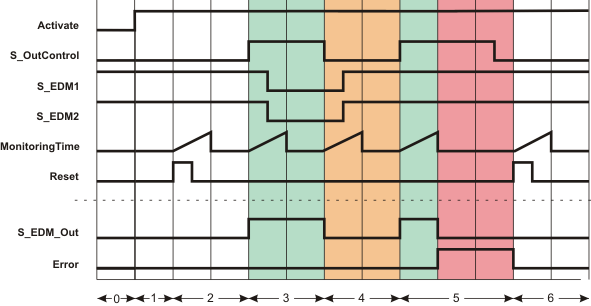 Das Rücksetzen des Funktionsbausteins durch eine positive Signalflanke an Eingang Reset kann dazu führen, dass Ausgang S_EDM_Out sofort auf SAFETRUE gesteuert wird (in Abhängigkeit der Zustände an den übrigen Eingängen).