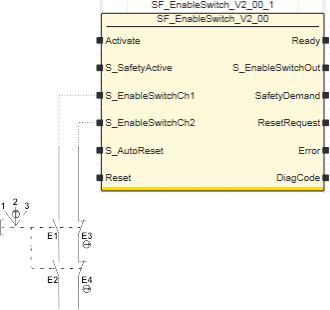 Das resultierende Signal der Schließerkontakte E1 und E2 des Zustimmschalters schließen Sie am Bausteineingang S_EnableSwitchCh1 an. Das resultierende Signal der Öffnerkontakte E3 und E4 schließen Sie am Bausteineingang S_EnableSwitchCh2 an. Mittels dieser definierten Signalreihenfolge der Kontakte kann der sicherheitsbezogene Funktionsbaustein die Schaltstufe des Zustimmschalters und dessen Schaltrichtung detektieren.