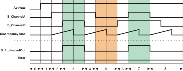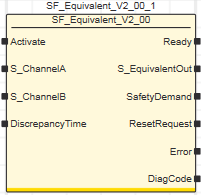 | Kurzbeschreibung | Der sicherheitsbezogene Funktionsbaustein SF_Equivalent überwacht die Signale von zwei sicherheitsbezogenen Eingangsklemmen auf gleiche Signalzustände. Diese Signale stammen typischerweise von zweikanaligen Sensoren oder Schaltern wie z.B. von einem NOT-HALT-Befehlsgerät.Das Freigabesignal S_EquivalentOut wird SAFETRUE, wenn der Funktionsbaustein aktiviert ist, keinen Fehler erkannt hat und die Eingänge S_ChannelA und S_ChannelB innerhalb der mit DiscrepancyTime eingestellten Zeit beide den Zustand SAFETRUE haben.Dazu muss der Funktionsbaustein aktiviert sein (Activate = TRUE) und darf keinen Fehler erkannt haben (Error = FALSE).