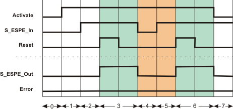 | 6 | Positive signal edge at the Reset input resets the restart inhibit, followed by normal operation. The S_ESPE_Out output becomes SAFETRUE. |