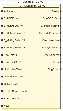 | The safety-related SF_MutingPar function block evaluates the signals of four muting sensors and an optoelectronic safety-related equipment (a light grid, for example) in an application for parallel muting with four sensors and switches the enable signal at the S_AOPD_Out output.The signal at the S_AOPD_Out output is the enable signal for the entire process. A SAFEFALSE signal at the S_AOPD_Out output stops the application in the zone of operation.This function can be used to temporarily deactivate (or "mute") safety-related equipment in the form of a light grid, for example, in order to allow an object which has been identified by the muting sensors as permissible (for the muting operation) to pass through on an assembly conveyor.In such a case, the interruption of the light grid does not have any effect on the S_AOPD_Out output. By contrast, if the safety-related equipment is engaged by an object which has not been identified by the muting sensors as permissible, the S_AOPD_Out output switches to SAFEFALSE. For example, if the hand of a worker passes through an assembly conveyer interrupting a light grid, the S_AOPD_Out output would be used to signal the actions necessary to set the zone of operation to its defined safe state.The maximum allowable time for the muting operation is monitored using the four muting sensors. Please refer to the following representation to view the arrangement of the muting sensors.In the event of a muting error, the safety-related shutdown requested by the safety function can be temporarily deactivated by means of the integrated override function, e.g., in order to move an impermissible object which caused the muting error outside the zone of operation. The override function must be manually requested by the operating personnel as long as the object is in a safeguarded area or the override function has been automatically exited. A start-up inhibit can be specified at S_StartReset.