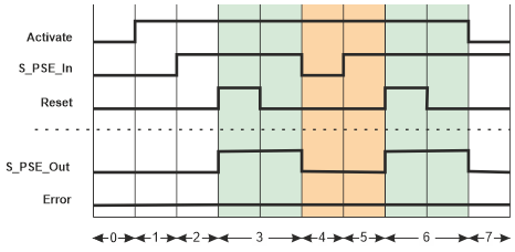 | 6 | Positive signal edge at the Reset input resets the restart inhibit, followed by normal operation. The S_PSE_Out output becomes SAFETRUE. |