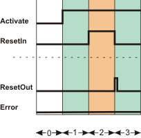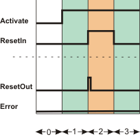 Per Bausteineingang kann festgelegt werden, ob an Eingang ResetIn eine steigende oder eine fallende Flanke (gemäß EN ISO 13849-1) ausgewertet wird. Zusätzlich kann bei Auswertung der fallenden Flanke die Dauer des Anforderungssignals überwacht werden.