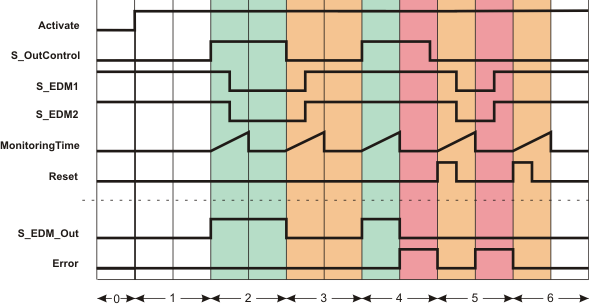 | 3 | Ausgang S_EDM_Out = SAFEFALSE durch ein SAFEFALSE an S_OutControl. Mit dem Zustandswechsel an S_EDM_Out startet die Überwachungszeit MonitoringTime. Während der Überwachungszeit wechseln S_EDM1 und S_EDM2 auf SAFETRUE (Grundzustand der angeschlossenen Schütze). |