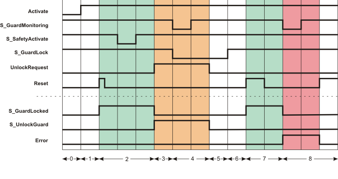 | 8 | Die Schutzeinrichtung wird ohne Anforderung durch UnlockRequest als geöffnet gemeldet (Eingang S_GuardMonitoring wird SAFEFALSE). Auch die Verriegelung der Schutzeinrichtung wird mit S_GuardLock = SAFETRUE bestätigt. Daraufhin wird S_GuardLocked = SAFEFALSE und eine Fehlermeldung wird ausgegeben (Fehlerausgang Error = TRUE). Nach der Fehlerbehebung wird die Fehlermeldung durch eine positive Signalflanke an Eingang Reset rückgesetzt. Fehlerausgang Error wird dann wieder FALSE. |