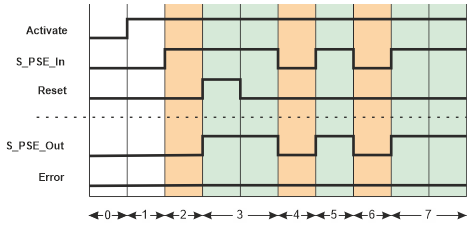 | 4 | Positive signal edge at the Reset input resets the restart inhibit, followed by normal operation. The S_PSE_Out output becomes SAFETRUE. |