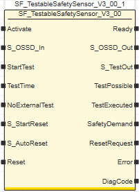 The enable output S_OSSD_Out of the SF_TestableSafetySensor function block is directly connected to a global I/O variable or to an output terminal of the application via additional safety-related functions/function blocks. The function block output TestPossible signals whether a test is possible and the TestExecuted output indicates whether the test was performed successfully or is currently in progress. Both outputs are connected to standard variables and can thus be processed in the higher-level standard controller. SafetyDemand signals the status "safety function requested". Connect the SafetyDemand output to an output terminal of your application, either directly or via other standard functions/function blocks.