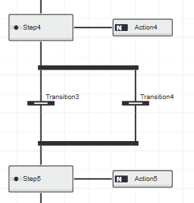 A simultaneous branch consists of at least two steps with the associated actions that are processed at the same time. A simultaneous branch always begins and ends with a step. All steps in the paths must be executed at least once before continuing with the SFC network. Simultaneous branches are represented in the free graphic editor using a double horizontal line.