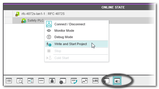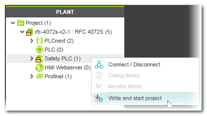 When writing the safety-related project image to the Safety PLC and starting the safety-related application, observe the safety warning message noted at the beginning of this topic.Refer to the topic "Controlling the safety-related application / Toolbar icons in the Safety Cockpit" for detailed information on the 'Write and Start' command.- In the PLANT, right-click the Safety PLC node and select 'Write and Start Project' from the context menu.
