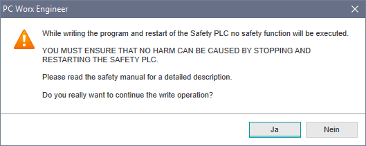 Confirm the message with 'Yes' to continue the 'write and start' procedure.WARNINGUnintended machine operation - Prior to writing the safety-related image and starting up the Safety PLC, make certain that the temporary absence of the safety-related application and therefore the downtime of the entire safety installations, cannot result in any hazardous situations.