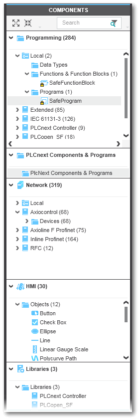 The COMPONENTS area at the right of the PLCnext Engineer user interface contains various categories of components that can be used in the engineering project. Both logical and physical components are available, from logical POUs up to devices. These components are considered as types.
