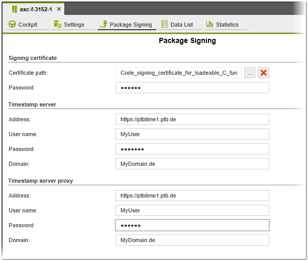Signing certificate container and the corresponding password are mandatory for a signed writing of the binary data. - Timestamp server (optional) When generating the digital signature, a timestamp is always added to the signature. By default (no timestamp server is specified), the digital signature will be time stamped from the local computer's time (current UTC date and time). To add a timestamp coming from a timestamp server (trusted third-party service), enter the server address (URI of the timestamp server) and the credentials used for authentication (user name, password, and domain). If no credentials are entered, the default credentials will be used.The timestamp itself is signed with the selected signing certificate and subsequently checked and verified by the firmware on the controller. A corresponding public key must also be contained in the trust list (list of certificates which are trusted). The timestamp ensures that the data were signed at a certain point in time (time of the signature creation) and have not been altered since then. By timestamping the digital signature, the signature of the data is preserved even if the signing certificate has expired.