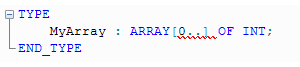 The data types parser detected a syntactical fault in the declaration of an ARRAY: the end value is missing in the value range at the underlined code position.