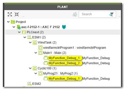 When switching to the extended debug mode 'Debug Functions', the PLANT shows the following: Each call of a function is visible as separate instance node (named 'functionname_Debug') under the respective program or FB instance node.