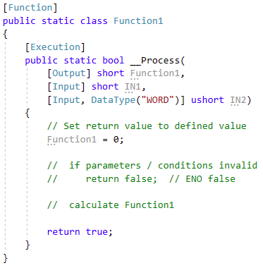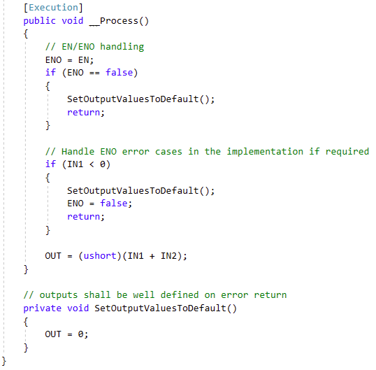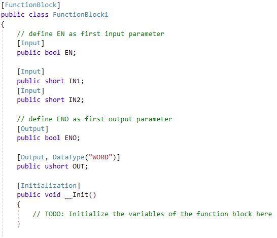 Analog to the IEC FB, the C# FB must define the EN/ENO parameters (as first parameters, in capital letters).