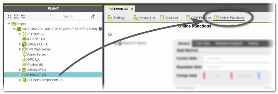 To open the editor, double-click the 'EtherCAT' node in the PLANT and then click 'Online Functions' in the editors area.