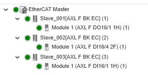 When opening the online functions while the controller is connected and accessible in the network, PLCnext Engineer automatically an EtherCAT bus scan and displays the detected devices in the bus structure tree.