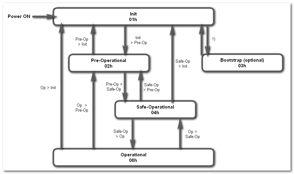 A state machine is implemented in each EtherCAT communication device. For each state it is defined which communication services are possible, i.e., active via EtherCAT. The state machine of the slave stations is controlled via the state machine of the EtherCAT master. This means that the state changes of a slave are usually requested by the master.