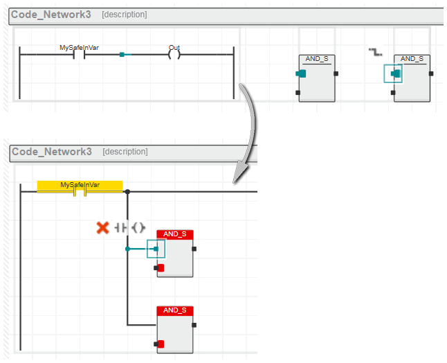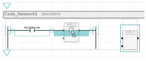 While dragging and dropping the object onto an existing LD network, the valid insertion positions for the object are indicated by colored markers (as shown in the following example). The connection line in the LD network is highlighted when the dragged object is permitted to be dropped.