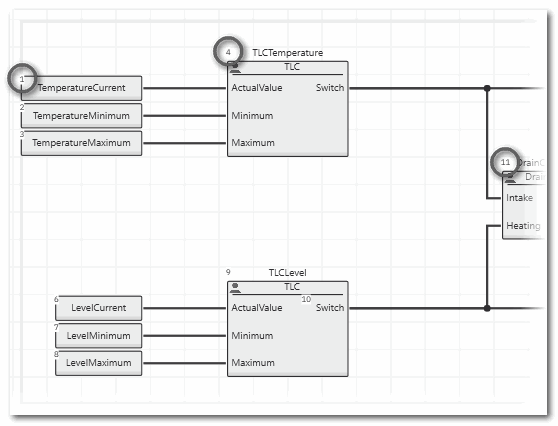 If activated in FBD/LD, NOLD and SFC, the execution order is indicated by a number at the top left of the object (as shown in the following example). The number is automatically assigned by PLCnext Engineer according to the object position. Execution starts with the object that has the lowest number.