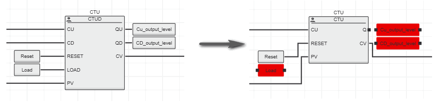 In the following example, the CTUD function block is replaced by the CTU function block. Any connection line to formal parameters of the replacing CTU function block with different names are deleted.