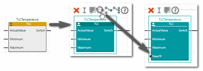 (input or output) of the replacing block differs, an already existing connection line to this FP is deleted. The FP has to be connected newly.