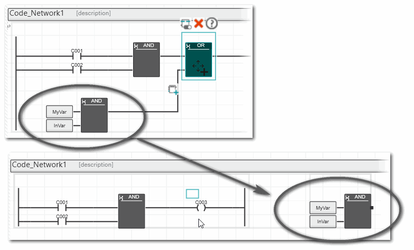 The following editing operations apply to FBD/LD and SFC worksheets. For NOLD and SNOLD worksheets, restrictions may apply which are then mentioned in the description.