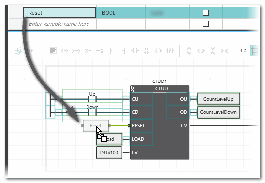 - Keep the mouse button pressed and drag the selection into the code worksheet and drop it at the desired position.When dragging the variable into a code worksheet that already contains a network, the valid insertion positions for the variable within the network are displayed by colored markers. As soon as a valid connection is detected by the editor when dragging the variable, the connection line is shown in green (in the following example the 'Reset' variable is dropped on the RESET formal parameter of the CTUD function block).