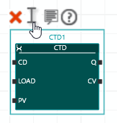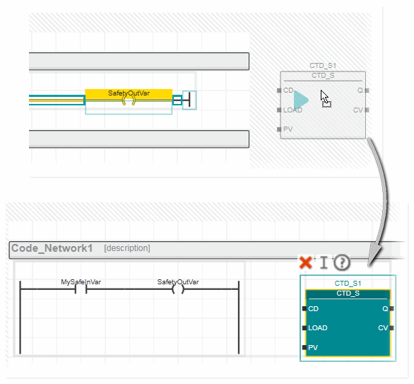 - If you have inserted a function block, an instance name is proposed by the programming system (shown above the FB block; 'CTD_1' in the example below). This FB instance name must be declared in the related variables table.