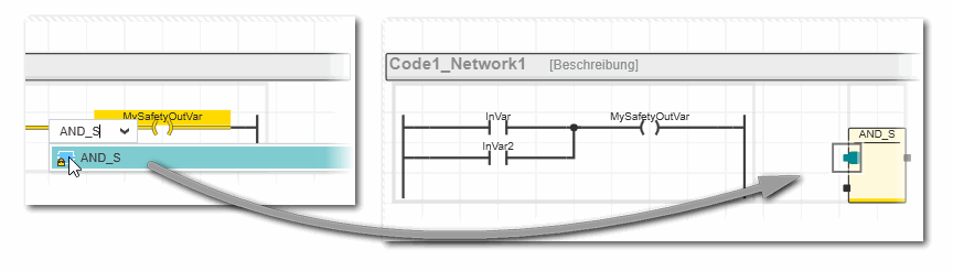 - In the appearing selection box, browse for the variable to be inserted (type the first character(s) of the variable to facilitate your search), select the variable and press <Enter>.To insert an input/output variable of an FB instance or a member of a STRUCT variable, enter the function block instance or STRUCT variable followed by a dot. The appearing selection box lists all input and output variables of the corresponding FB instance resp. all members of the corresponding STRUCT variable.