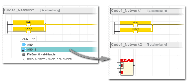 - In FBD/LD, objects can also be inserted at any free position (empty cell) to connect them afterwards.