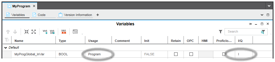 - In the 'I/Q' column, specify whether the variable is to be connected to an input signal (I) or output signal (Q).Setting the data direction in the 'I/Q' column of the program variables table automatically adds the program-global variable to the Data List of the resource.