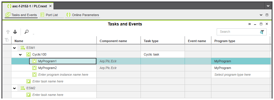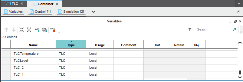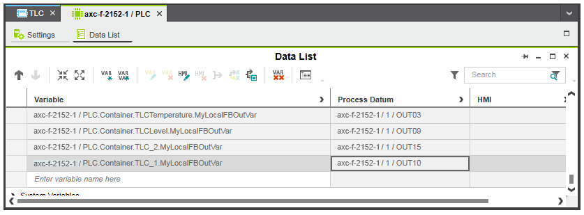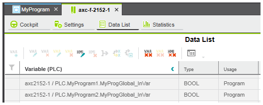 - Double-click the 'IEC 61131-3' node in the PLANT and open the Data List. The variable is inserted here for each instance of the program in which the variable is declared. Its 'Usage' is automatically set to 'Program'.