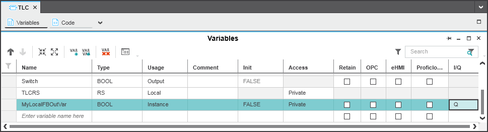The field 'I/Q' becomes active and the data direction 'I' is preset. - In the 'I/Q' column, specify whether the variable is to be connected to an input signal (I) or output signal (Q).Setting the data direction in the 'I/Q' column of the FB variables table automatically adds the local variable to the Data List of the resource.