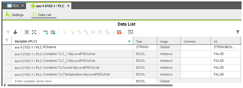 - Double-click the 'IEC 61131-3' node in the PLANT and open the Data List. The variable is inserted here for each instance of the FB in which the variable is declared. Its 'Usage' is automatically set to 'Instance'.