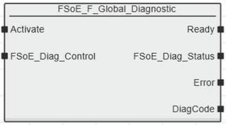 Output values: » Ready = FALSE » FSoE_Diag_Status = 0x0000 » Error = FALSE » DiagCode = 0x0000 | Activate the function block by switching Activate to TRUE. |