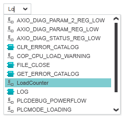 The Intellisense function facilitates the insertion of code elements (variables, FB instances, standard functions and function blocks, connectors, etc.) into graphical code worksheets via keyboard. By typing any character into an edit box, the editor provides all elements in a selection box that contain the entered character(s) in their name and that may be inserted at the current position (the input is not case sensitive). By typing more characters the list is further filtered. In the selection box, any element is indicated with a specific icon and the element name.
