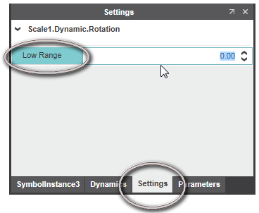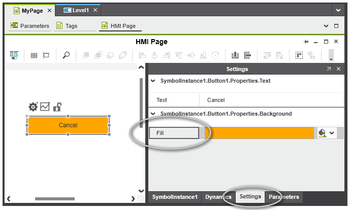 Certain object/dynamic properties can be published as editable HMI symbol settings. Editable means, the properties are provided as additional properties for an HMI symbol instance used in an HMI page. The published symbol settings are edited on the 'Settings' tab in the properties window of the corresponding HMI symbol instance.