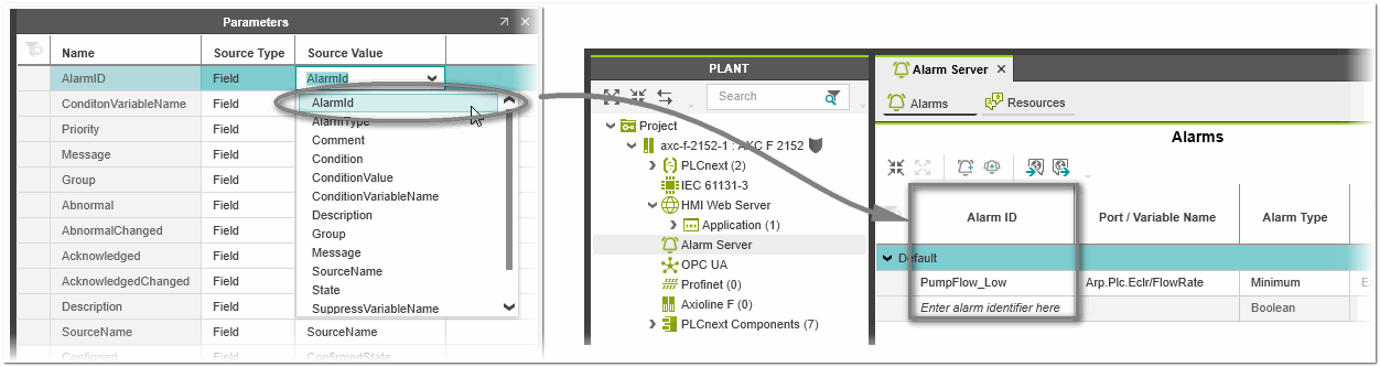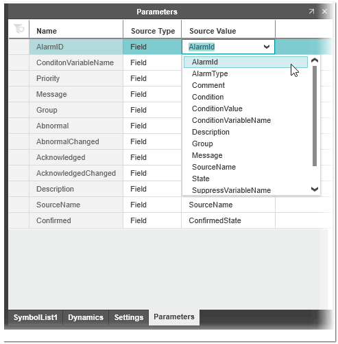 All alarm information queried from the alarm source at runtime is stored in the alarm array (one-dimensional array). The array has a fixed number of elements. Each element in the array represents a specific alarm value or property, such as the alarm id, alarm message, priority, state, etc. In the HMI application, the access to the array elements and their values is done by binding the symbol parameters of an HMI Symbol List of source type 'AlarmView' to the array field elements (see the following figure and also the HMI alarming example).