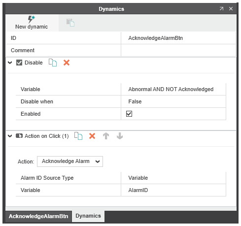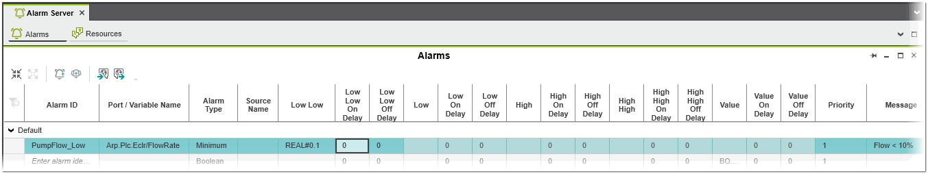 Property Value Description Alarm ID PumpFlow_Low Unique name of the alarm (must not contain blanks or special characters). Port / Variable Name Arp.Plc.Eclr/FlowRate Variable 'FlowRate' that is monitored. Alarm Type Minimum The 'FlowRate' is compared to the 'LowLow' limit. If the value drops below the limit, the alarm is triggered. The alarm remains active until the value exceeds the 'LowLow' limit. LowLow REAL#0.1 The alarm will be triggered when the 'FlowRate' is lower than or equal to 10 percent. The alarm remains active until the value exceeds the limit. Priority 1 Alarm priority (1 = lowest alarm priority). Message Flow < 10% Text that will be shown to the operator in the HMI application when the alarm is active. Description Pump flow is below operating threshold Description that will be shown to the operator in the HMI application when the alarm is active. Access Rights:'Acknowledge Required''Confirm Required' 'Suppression Allowed' All checkboxes activated Actions that the operator must take when an alarm is active. - 'Acknowledge Required'The operator must acknowledge the alarm to set the alarm to the acknowledged state.