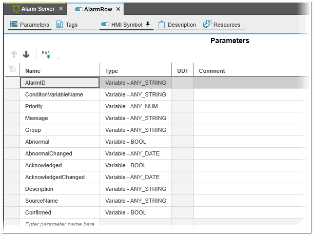 - In the 'Parameters' editor, add the following symbol parameters (will be bound to the alarm array fields when instantiated in the AlarmTable symbol list).