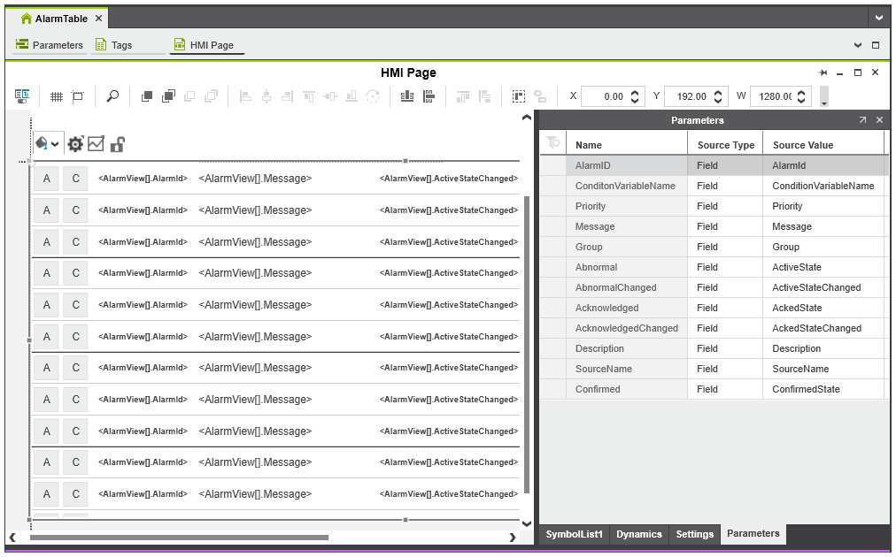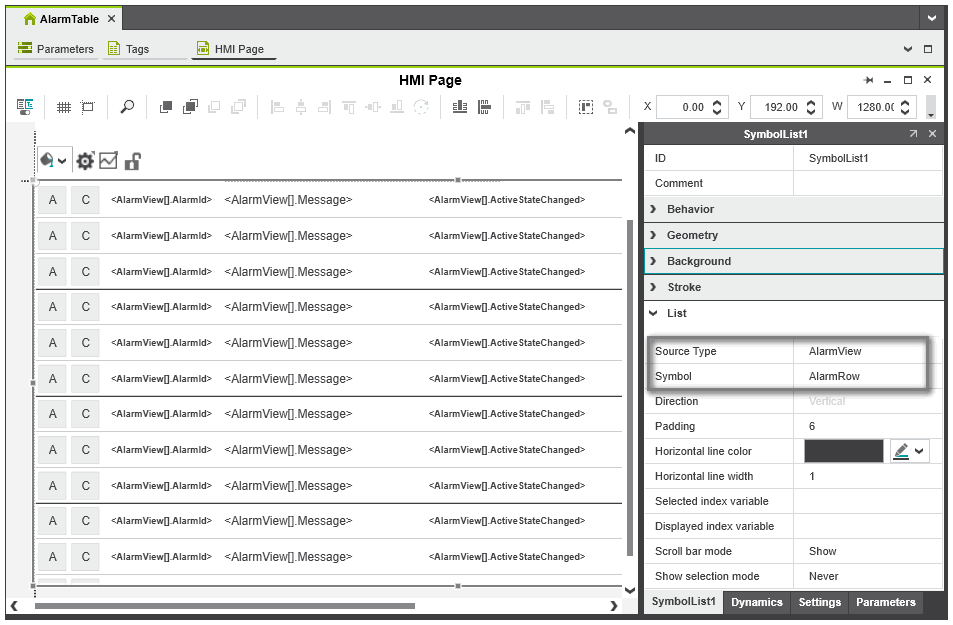 - In the 'Properties' tab of the symbol list, open the 'List' group and set the 'Source Type' to 'AlarmView' and select the 'AlarmRow' symbol for the 'Symbol' parameter.With the 'AlarmView' source type you get access to the alarm array fields (see the following step) which contain all alarm information queried from the alarm source at runtime.